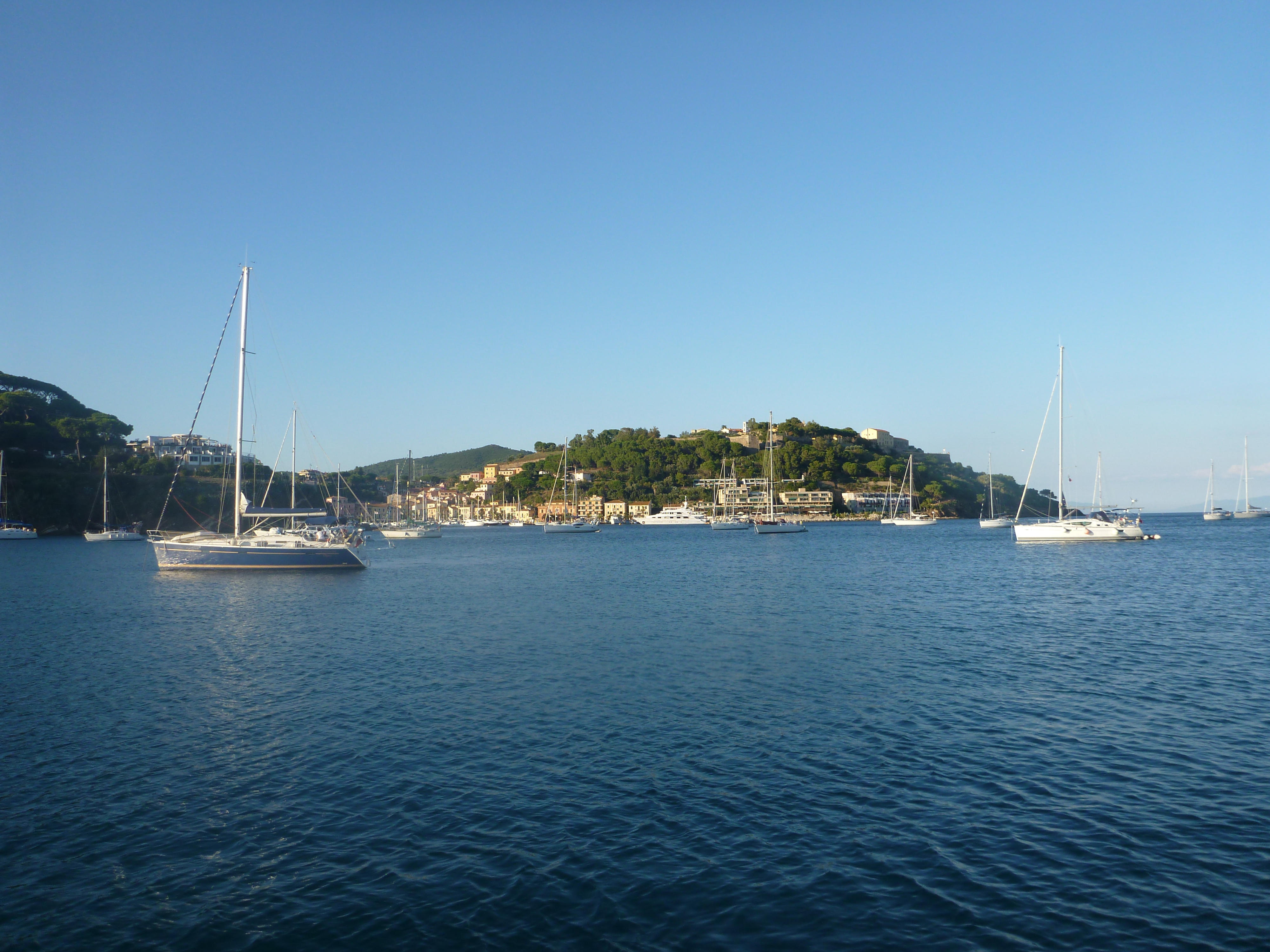 We had a good sail with our friends Gayle and Mark from Corsica to Elba. Another change of language from French back to Italian. As we entered an anchorage in Golfo della Biodala on the north coast we were hailed on the VHF by the French couple we had met in Bonifacio so they joined us for drinks in their bay. We were the only boats anchored there and the reason why became apparent during the night as, there being no wind at all, the swell from seaward caused the boat to roll so much that sleep was virtually impossible.