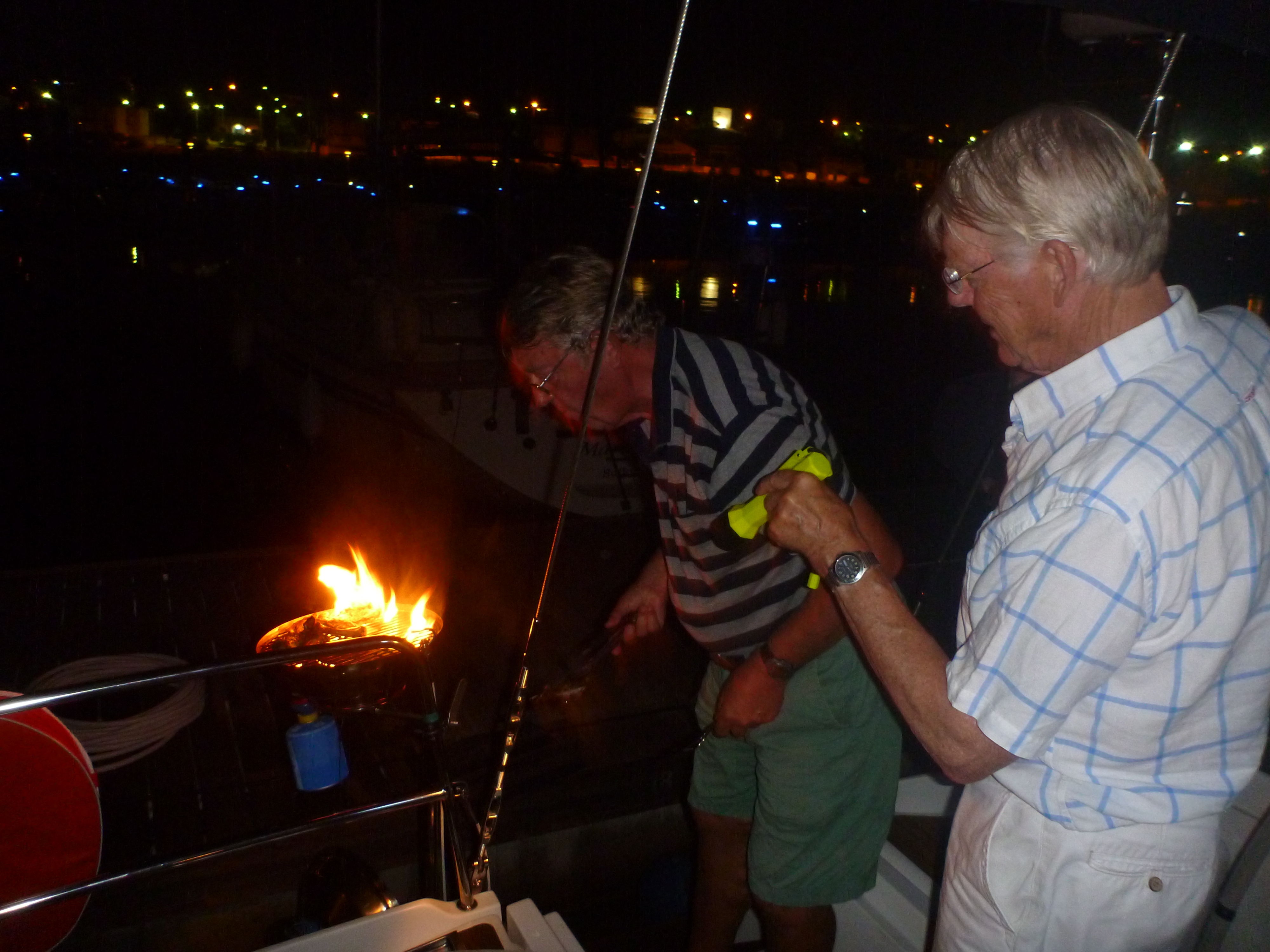 The crew’s last night on Exotica entailed the obligatory hose down and Inox shine before dinner on board, a BBQ no less, accompanied by Terry’s iPod playing Wagner and Strauss to Tom Lehrer and Bing Crosby.