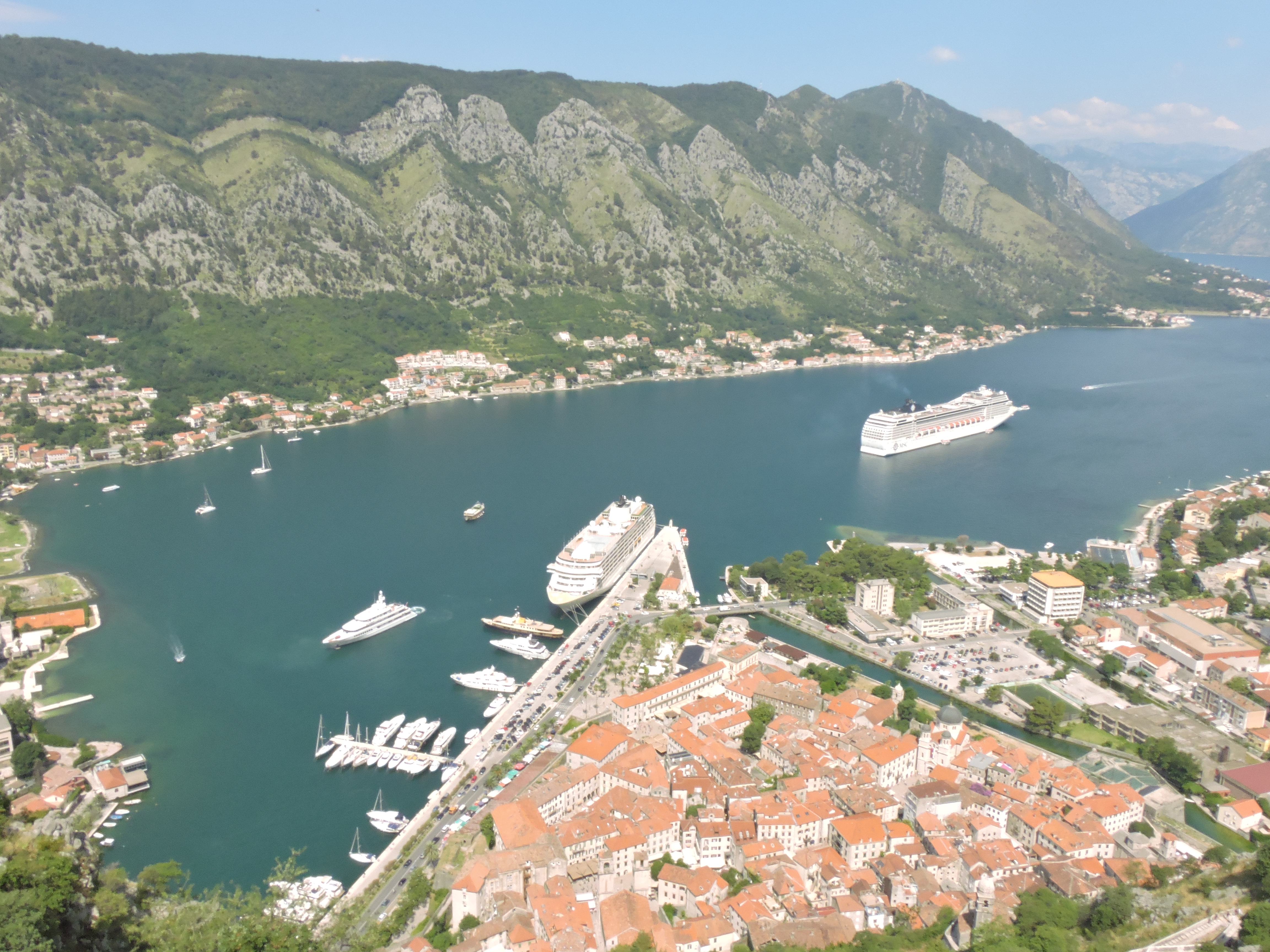 Old town Kotor in foreground. The World cruise liner on dock, Exotica, smallest boat end of jetty!