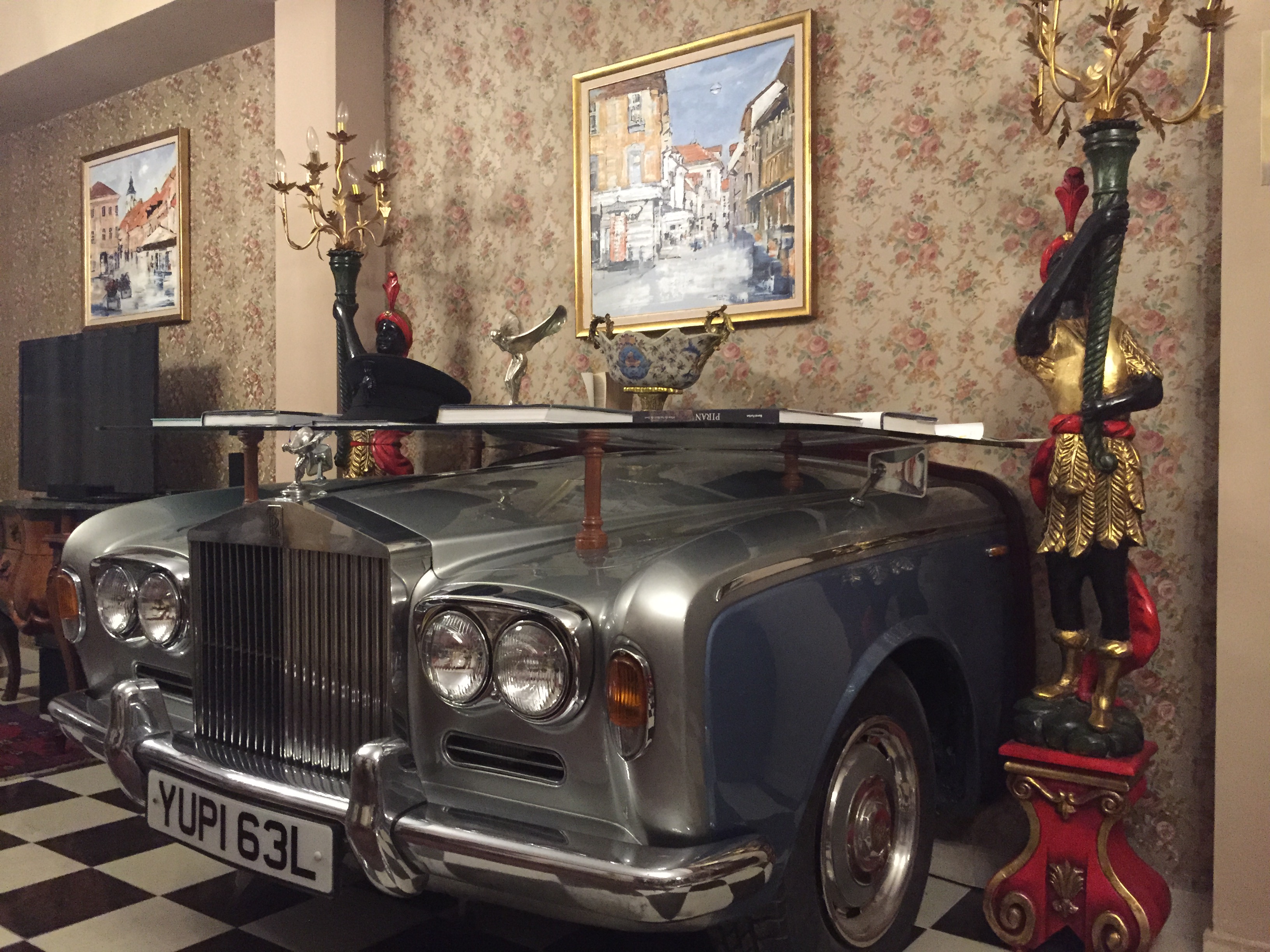 The previous owner had been a Rolls Royce fanatic so memorabilia festooned the walls and one of his cars had been cut in two and stuck in the walls of two rooms. Dinner of young venison and wild goat was without doubt the best meal we have eaten all summer.
