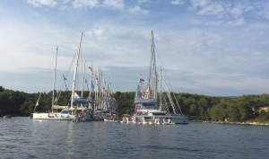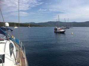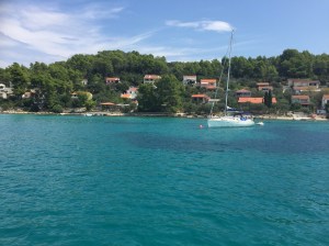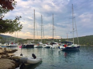 A gentle sail the following day to Hvar, probably the most famous of the Croatian islands for expensive living and wild parties of the rich and famous. We found a delightful spot with three adjoining bays near Starigrad and picked up a mooring in the middle arm. During the afternoon a vast charter fleet sailed into the right arm. We took the dinghy round to have a look and counted sixty-five yachts and catamarans all rafted together, calling themselves Yacht Week. A brief search on the internet revealed that this was an organised sail in company where the average age was twenty-seven. We expected a huge noisy party but apart from a little bass noise we were not unduly disturbed, or could a short, sharp shower at 11pm have dampened their ardour.