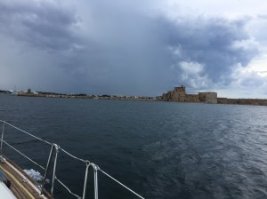 We motored 64nm in nine hours to the next large port of Brindisi. A less comfortable trip as there were storms around which we could plainly see and managed to avoid, although along the edge of them were some strong winds. We tied up in the Brindisi Marina during a lull. This was the port we departed Italy in June 2015 to Montenegro and Croatia.