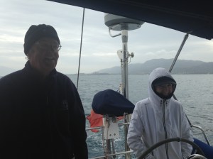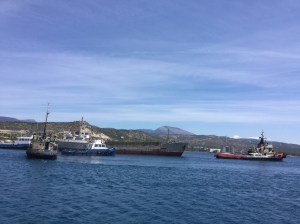 On Saturday May 18th we departed at daybreak from Athens to make the return journey through the Corinth Canal and the Gulf of Corinth where this time we had a cold hard motor against the wind and sea. Made more tedious by having to wait over two hours before entering the canal because of very slow towing tugs.