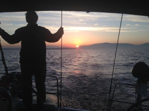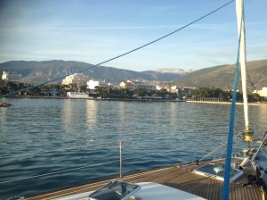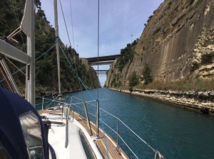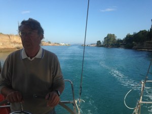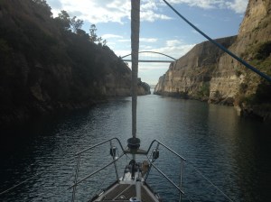 From Patras to Corinth we had one of the best sails ever. After an early start we caught a following wind up to 28 knots and with full sail we barrelled down the Gulf of Corinth, the stretch of water that divides the Greek mainland from the Peloponnese. At times Exotica was surfing at 10.5 knots, very exhilarating if a bit scary. We had to gybe about seven times and then, the weather gods being kind, the wind dropped as we entered the little harbour of Corinth, after our 66nm ride.