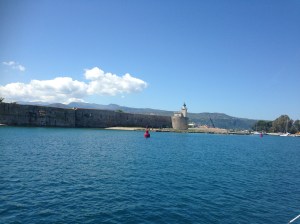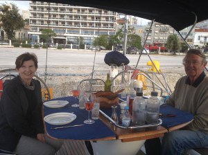 Then on to Patras, a 37nm passage, the third biggest city in Greece and the capital of the Peloponnese. We took a lazy line on the town quay wall which was so high that it was mighty dangerous to climb off the boat. Julie and Lesley did, very gingerly, and declared the town to be charming, full of designer shops but not one supermarket to be found.