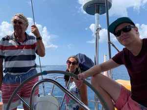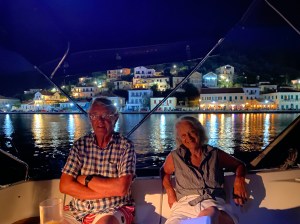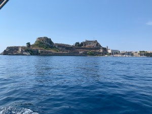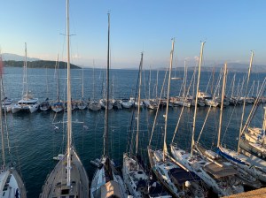 Our gentle sail towards Porto Mandraki, a delightful marina at the foot of the fort at Corfu, was threatened by a fast developing black cloud in the north moving quickly towards us so sails down and a very quick entry to our safe harbour. Fortunately, there’s a stony beach which the children loved and reportedly the best taverna in town where we had a delightful family meal.