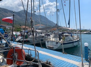 From Lakka, we motored 31nm to the huge marina on the island of Corfu at Gouvia where after midnight Terry’s nephew Duncan, wife Nayeli and children Toren and Isla arrived. This is the first time we have had eight on board, luckily the early evening violent storm cleared and the children slept very happily in the cockpit.