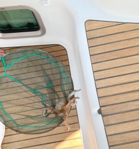 During the night there was short squall, and we thought a towel might have gone overboard. There was a flat shape on the seabed and Edward dived down to retrieve it only to discover it was a sheet of black plastic. He shook it out, brought it on board and bagged it for disposal. We were all swimming when Julie let out a scream as an octopus crawled out of the bag and headed along the cockpit towards the saloon. Edward quickly grabbed the fishing net we have for retrieving things that fall overboard and scooped the creature up before transferring it again to the ocean. Perhaps it should have gone on the barbecue.