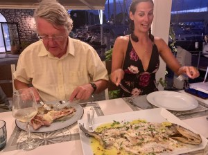A storm in Ithaca town cleared in time for us to dinghy ashore and enjoy what we could have caught!