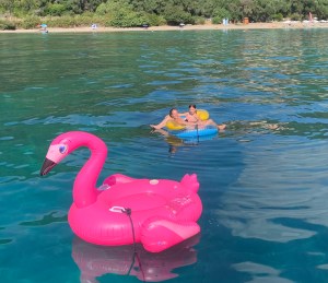 It’s always a bit sad leaving Mandraki marina but motored to Ipsos bay, north of Corfu town for a swim and lunch on board and were delighted to see a pod of dolphins playing around the boat. The first we have seen this year.